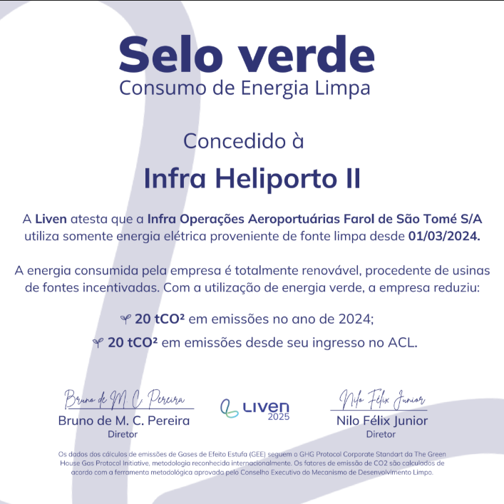 A INFRA Operações Aeroportuárias Farol de São Tome S.A, empresa concessionaria que administra o Heliporto Farol de São Tomé, em…